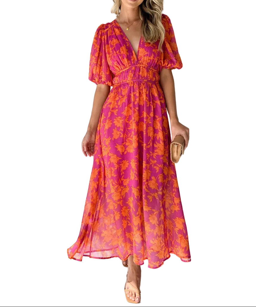 Women's Floral V Neck Midi Dress with Puff Sleeves