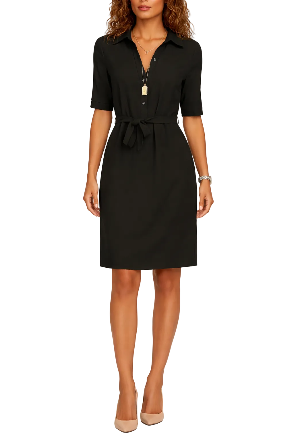 Women’s Half Sleeve Collared Midi Dress with Waist Tie