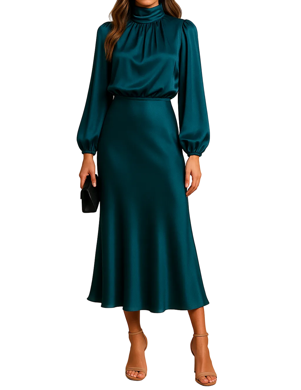 Women’s High Neck Long Sleeve Midi Dress High Waist Shape