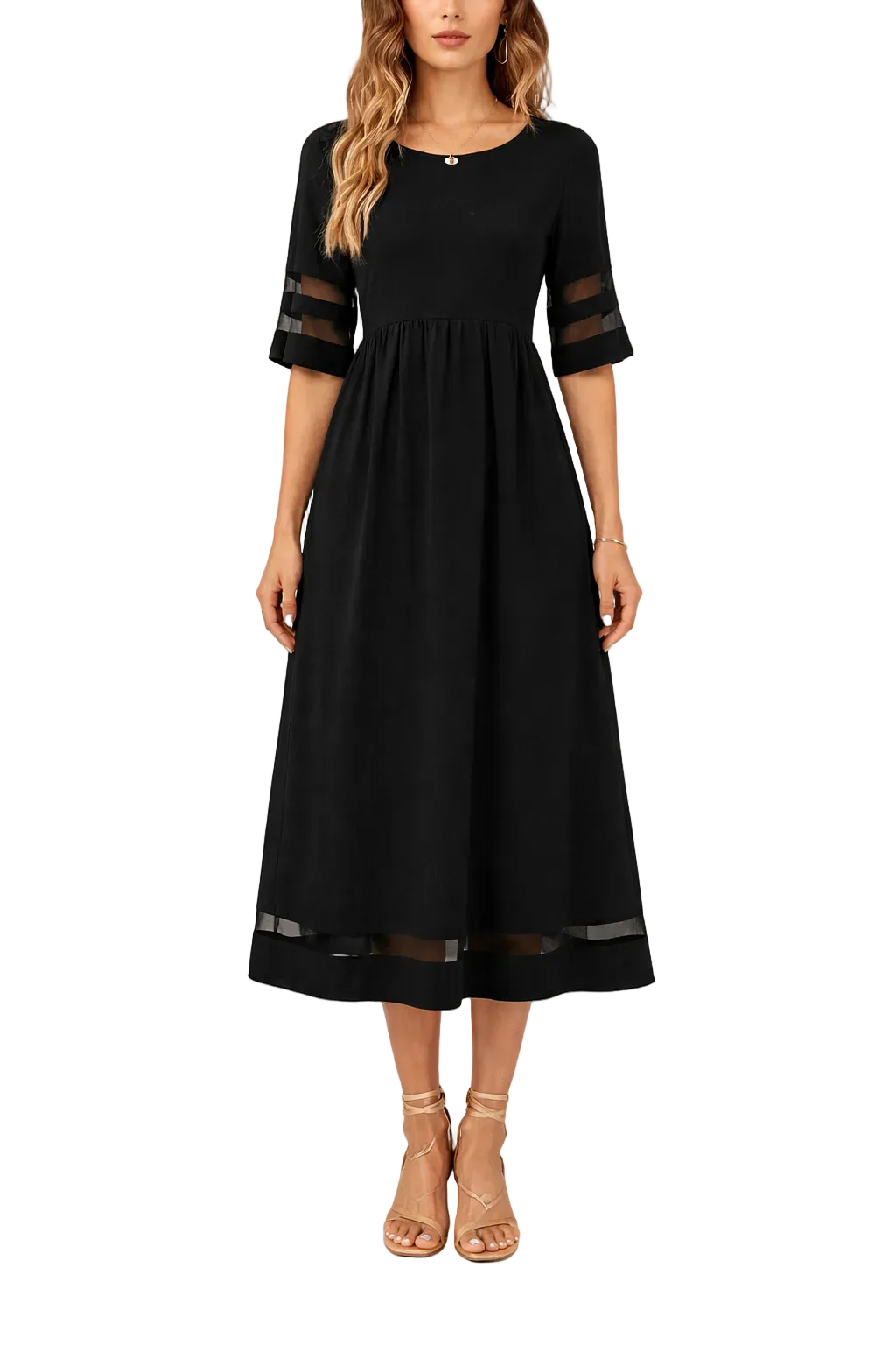 Women's Round Neck Short Sleeve Midi Dress with Waist Seam