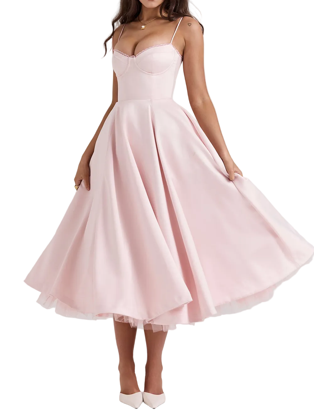 Women's Corset Midi Dress with Tulle Skirt and Spaghetti Straps